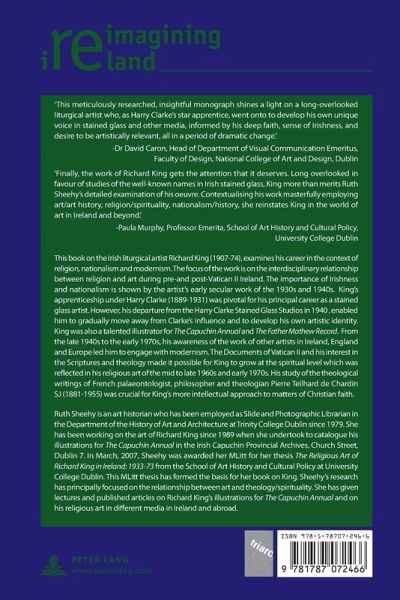 This book on the Irish liturgical artist Richard King (1907-74), examines his career in the context of religion, nationalism and modernism. The book focuses on the interdisciplinary relationship between religion and art during pre- and post-Vatican II Ireland. The importance of Irishness and nationalism is shown by the artist's early secular work of the 1930s and 1940s. His apprenticeship under Harry Clarke (1889-1931) was pivotal for his principal career as a stained glass artist. However, his departure from the Harry Clarke Stained Glass Studios in 1940 allowed him to gradually move away from Clarke's influence and to develop his own artistic identity. King was also a talented illustrator for The Capuchin Annual and The Father Mathew Record. From the late 1940s to the early 1970s, his awareness of the work of other artists in Ireland, England and Europe led him to engage with modernism. The Documents of Vatican II and his interest in the Scriptures and theology enabled King to grow at the spiritual level which was reflected in his religious art of the mid to late 1960s and early 1970s. His study of the theological writings of French palaeontologist, philosopher and theologian Pierre Teilhard de Chardin (1881-1955) was crucial for King's more intellectual approach to matters of Christian faith.