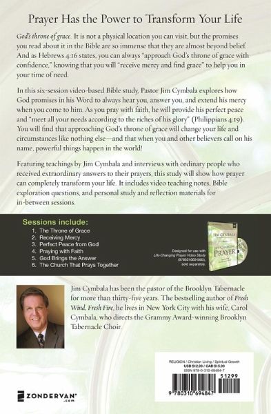 Discover how prayer can completely transform your life and put you in the presence of God's throne of grace. Hebrews 4:16 says you can always "approach God's throne of grace with confidence," knowing that you will "receive mercy and find grace" to help you in your time of need. That promise is so immense it's difficult for us to understand. In this six-session video-based Bible study (DVD/digital video sold separately), Pastor Jim Cymbala explores how God promises in his Word to always hear you, answer you, and extend his mercy when you come to him. As you pray with faith, he will provide his perfect peace and "meet all your needs according to the riches of his glory" (Philippians 4:19). You will find that approaching God's throne of grace will change your life and circumstances like nothing else--and that when you and other believers call on his name, powerful things happen in the world! Featuring teachings by Jim Cymbala and interviews with ordinary people who received extraordinary answers to their prayers, this study includes video teaching notes, Bible exploration questions, and personal study and reflection materials for in-between group sessions. Sessions include: The Throne of Grace Receiving Mercy Perfect Peace from God Praying with Faith God Brings the Answer The Church that Prays Together Designed for use with the Life-Changing Prayer Video Study (sold separately).