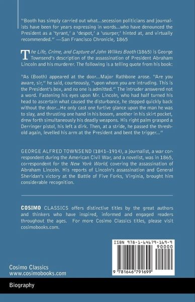 "Booth has simply carried out what ... secession politicians and journalists have been for years expressing in words ... who have denounced the President as a ‘tyrant,’ a ‘despot,’ a ‘usurper,’ hinted at, and virtually recommended." —San Francisco Chronicle, 1865 The Life, Crime, and Capture of John Wilkes Booth (1865) is George Townsend’s description of the assassination of President Abraham Lincoln and his murderer. The following is a telling quote from his book: "As (Booth) appeared at the door… Major Rathbone arose. "Are you aware, sir," he said, courteously, "upon whom you are intruding.…mehr
