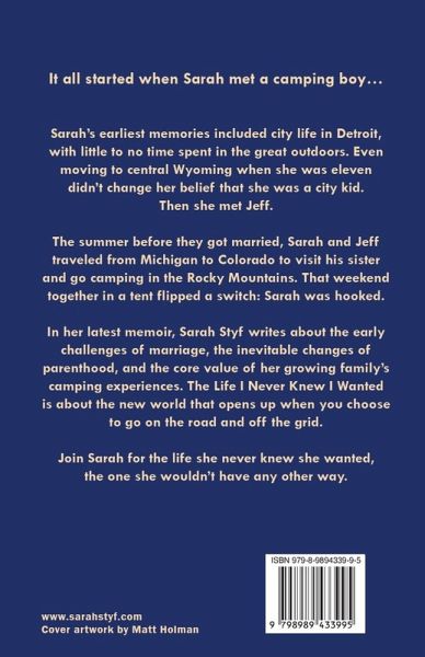 Sarah's earliest memories included city life in Detroit, with little to no time spent in the great outdoors. Even moving to central Wyoming when she was eleven didn't change her belief that she was a city kid. Then she met Jeff. The summer before they got married, Sarah and Jeff traveled from Michigan to Colorado to visit his sister and go camping in the Rocky Mountains. That weekend together in a tent flipped a switch: Sarah was hooked. In her latest memoir, Sarah Styf writes about the early challenges of marriage, the inevitable changes of parenthood, and the core value of her growing family's camping experiences. The Life I Never Knew I Wanted is about the new world that opens up when you choose to go on the road and off the grid. Join Sarah for the life she never knew she wanted, the one she wouldn't have any other way.