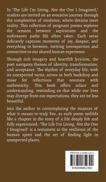 In "The Life I'm Living, Not the One I Imagined," readers are invited on an evocative journey through the complexities of existence, where dreams meet reality. This collection of poignant poems explores the tension between aspirations and the unforeseen paths life often takes. Each verse delicately captures moments of joy, despair, and everything in between, inviting introspection and connection to our shared human experience. Through rich imagery and heartfelt lyricism, the poet navigates themes of identity, transformation, and acceptance. The rhythm of everyday life, with its unexpected turns, serves as both backdrop and muse for reflections that resonate with authenticity. This book offers solace and understanding, reminding us that while our lives may diverge from our expectations, they are no less beautiful. Join the author in contemplating the nuances of what it means to truly live, as each poem unfolds like a chapter in the story of a life deeply felt and fully experienced. "The Life I'm Living, Not the One I Imagined" is a testament to the resilience of the human spirit and the art of finding light in unexpected places.