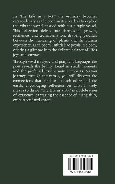 In "The Life in a Pot," the ordinary becomes extraordinary as the poet invites readers to explore the vibrant world nestled within a simple vessel. This collection delves into themes of growth, resilience, and transformation, drawing parallels between the nurturing of plants and the human experience. Each poem unfurls like petals in bloom, offering a glimpse into the delicate balance of life's joys and sorrows. Through vivid imagery and poignant language, the poet reveals the beauty found in small moments and the profound lessons nature imparts. As you journey through the verses, you will discover the connections that bind us to each other and the earth, encouraging reflection on what it truly means to thrive. "The Life in a Pot" is a celebration of existence, capturing the essence of living fully, even in confined spaces.