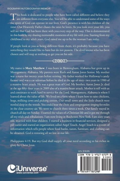 This book is dedicated to people who have been called different and believe they are different from everyone else. You will be able to understand some of the ways the spirit of God can operate in our lives. God's presence is with his children all the time. Our Heavenly Father chases the ones he loves. As you look over your life, you will see that God has been there with you every step of the way. This is demonstrated in this book by my sharing memorable moments of my life with you. Starting from my childhood to my adult years, God raised me up to be the woman I am today. If people look at you as being different from them, it's probably because you have something they would like to have but do not possess. The devil knows who has been chosen and will stop at nothing to get you on his side.