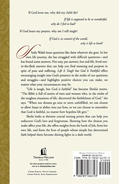 If God loves me, why did my child die? If life is supposed to be so wonderful, why do I feel so bad? If God hears my prayers, why am I still single? If God is in control of the world, why is life so hard? Sheila Walsh hears questions like these wherever she goes. In her own life journey, she has struggled with difficult questions?and has found some answers. Not easy, pat answers, but real-life, lived-out-in-the-flesh answers that can help you find meaning and purpose in spite of pain and suffering. Life Is Tough but God Is Faithful offers encouraging insight into God's presence in the midst of our questions and struggles?and highlights positive choices you can make, no matter what your circumstances may be. "Life is tough, but God is faithful" has become Sheila's motto. "The Bible is full of stories of men and women who, in the midst of the toughest situations of life, discovered the faithfulness of God," she says. "When our dreams go sour or seem unfulfilled, we can choose to allow Satan to slither into our lives, or we can choose to remember that God is faithful, no matter how hopeless life gets." Sheila looks at thirteen crucial turning points that can help you rediscover God's love and forgiveness. Showing how the choices you make affect your life, she offers insights from the book of Job, from her own life, and from the lives of people whose simple but determined faith helped them become shining lights in a dark world.