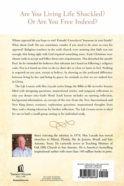 OVER 2 MILLION SOLD IN THE LIFE LESSONS SERIES! Whose approval do you hope to win? Friends? Coworkers? Someone in your family? What about God? Do you sometimes wonder if you need to do more to earn his approval? Religious teachers in the early church were insisting that faith was not enough, that being right with God required something more. Early Christians were almost ready to accept and follow these extra requirements. This disturbed the apostle Paul. So he reminded the believers that salvation isn't based on following a religious code. Nor is it based on what we do (or don't do) or what we know or feel. Nothing is required on our part, except to believe. In showing us the profound difference between living by law and living by grace, he reminds us that we are indeed free in Christ. As you read, study, journal, and discuss the book of Galatians, watch for these key themes that Max will unpack throughout the book: Salvation comes by grace, not works. We should bear the fruit of the Holy Spirit in our lives. We will reap in life what we have sown in life. The Life Lessons with Max Lucado series brings the Bible to life in twelve lessons filled with intriguing questions, inspirational stories, and poignant reflections to take you deeper into God's Word. Each lesson includes: An opening reflection on the Bible book you're studying. Background information to deepen your understanding of the cultural and historical setting. An excerpt of the text (from the NIV and the NKJV). Exploration questions with plenty of room to write your own thoughts and notes. Inspirational thoughts from Max as well as a closing takeaway for further reflection. The Life Lessons series is ideal for use in both a small-group setting or for individual study.