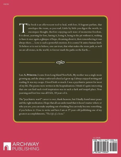 The book is an effervescent tool to heal, with love. A fragrant parfum, that envelopes the room, as you read. Little by little you digest the words, to encompass thought, therfore enjoying each wave of momentus freedom. It is about, yearning for love, having it, losing it, being in the pit without it, wishing to have it once again,a glimpse of hope, dreaming about it, then remembering it was always there... Love is such a powerful emotion. It is cosmic! It unites human kind. To believe or to not to believe, one can trust, that what makes the stone path, as well we are all stones, in the world, to forever mark the paths on the Earth...