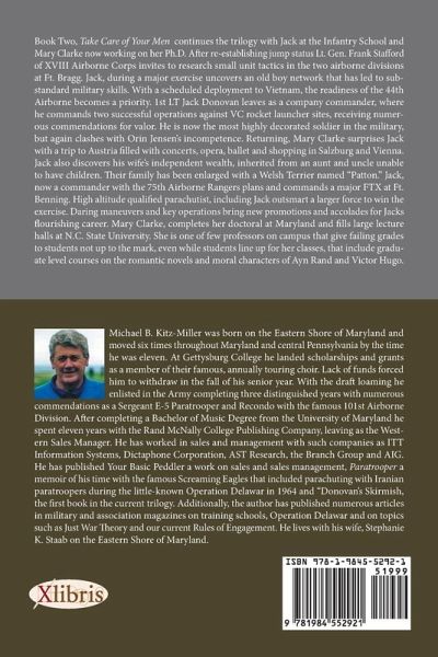Book Two: Take Care of Your Men-part of the trilogy-continues with Jack and Mary Clarke's careers flourishing. Jack's training continues at the infantry school, air assault school, and in reestablishing his jump status. His mentor, Lt. Gen. Frank Stafford, is now commander of Eighth Airborne Corps and invites Jack for a special assignment to research small unit tactics in the two airborne divisions at Fort Bragg. Jack uncovers an old boy network that has led to substandard basic military skills. With one unit scheduled for deployment to Vietnam, there is great concern making their readiness a priority. First Lieutenant Donovan leaves for his third tour in Vietnam as a company commander, where he commands two successful operations against VC-rocket launcher sites, receiving numerous commendations for valor. He is now the most highly decorated soldier in the military, but he again clashes with Orin Jensen's incompetence. Returning from Vietnam as acting battalion commander, Mary Clarke surprises Jack with a planned trip to Austria. Their love of opera and classical music fills their evenings in Salzburg and Vienna. Jack has also discovered his wife's independent wealth, having inherited a substantial sum from an aunt and uncle unable to have their own children. Money will never be a problem for the Donovans, whose family has been enlarged with a Welsh terrier named Patton. Jack, now a battalion commander with the Seventy-Fifth Airborne Rangers, plans and commands a major field training exercise at Fort Benning. Using high-altitude qualified parachutists, which includes himself, he outsmarts a larger force to win the exercise. Daring maneuvers against the Tenth Mountain Division allow Jack's rangers to win yet another FTX at Fort Drum and new promotions. Mary Clarke, with a new PhD from the University of Maryland, fills large lecture halls at NC State University. She is one of few professors on campus that give failing grades to students that are not up to the mark, even while students line up for her classes, which includes graduate-level courses on the romantic novels and their many moral characters of Ayn Rand and Victor Hugo.