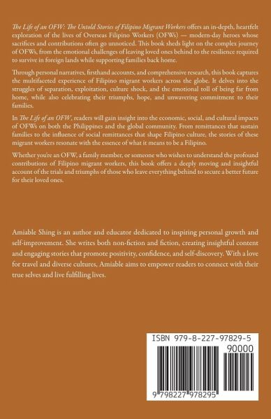 The Life of an OFW: The Untold Stories of Filipino Migrant Workers offers an in-depth, heartfelt exploration of the lives of Overseas Filipino Workers (OFWs) - modern-day heroes whose sacrifices and contributions often go unnoticed. This book sheds light on the complex journey of OFWs, from the emotional challenges of leaving loved ones behind to the resilience required to survive in foreign lands while supporting families back home. Through personal narratives, firsthand accounts, and comprehensive research, this book captures the multifaceted experience of Filipino migrant workers across the globe. It delves into the struggles of separation, exploitation, culture shock, and the emotional toll of being far from home, while also celebrating their triumphs, hope, and unwavering commitment to their families. In The Life of an OFW, readers will gain insight into the economic, social, and cultural impacts of OFWs on both the Philippines and the global community. From remittances that sustain families to the influence of social remittances that shape Filipino culture, the stories of these migrant workers resonate with the essence of what it means to be a Filipino. Whether you're an OFW, a family member, or someone who wishes to understand the profound contributions of Filipino migrant workers, this book offers a deeply moving and insightful account of the trials and triumphs of those who leave everything behind to secure a better future for their loved ones.