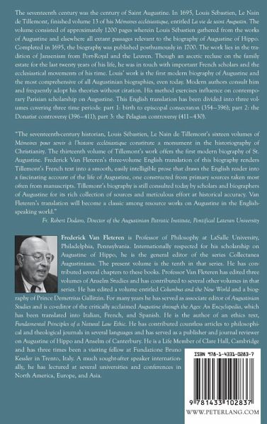 The seventeenth century was the century of Saint Augustine. In 1695, Louis Sébastien, Le Nain de Tillemont, finished volume 13 of his Mémoires ecclésiastique, entitled La vie de saint Augustin. The volume consisted of approximately 1200 pages wherein Louis Sébastien gathered from the works of Augustine and elsewhere all extant passages relevant to the biography of Augustine of Hippo. Completed in 1695, the biography was published posthumously in 1700. The work lies in the tradition of Jansenism from Port-Royal and the Leuven. Though an ascetic recluse on the family estate for the last twenty years of his life, he was in touch with important French scholars and the ecclesiastical movements of his time. Louis' work is the first modern biography of Augustine and the most comprehensive of all Augustinian biographies, even today. Modern authors consult him and frequently adopt his theories without citation. His method exercises influence on contemporary Parisian scholarship on Augustine. This English translation has been divided into three volumes covering three time periods: part 1: birth to episcopal consecration (354-396); part 2: the Donatist controversy (396-411); part 3: the Pelagian controversy (411-430).