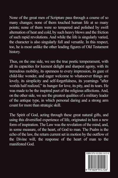 None of the great men of Scripture pass through a course of so many changes; none of them touched human life at so many points; none of them were so tempered and polished by swift alternation of heat and cold, by such heavy blows and the friction of such rapid revolutions. And while the life is singularly varied, the character is also singularly full and versatile. In this respect, too, he is most unlike the other leading figures of Old Testament history. Thus, on the one side, we see the true poetic temperament, with all its capacities for keenest delight and sharpest agony, with its tremulous mobility, its openness to every impression, its gaze of child-like wonder, and eager welcome to whatsoever things are lovely, its simplicity and self-forgetfulness, its yearnings "after worlds half realized," its hunger for love, its pity, and its tears. He was made to be the inspired poet of the religious affections.¿And, on the other side, we see the greatest qualities of a military leader of the antique type, in which personal daring and a strong arm count for more than strategic skill. The Spirit of God, acting through these great natural gifts, and using this diversified experience of life, originated in him a new form of inspiration. The Law was the revelation of the mind, and, in some measure, of the heart, of God to man. The Psalm is the echo of the law, the return current set in motion by the outflow of the Divine will, the response of the heart of man to the manifested God. *** This Premium Edition includes an Easy to Read Layout making reading comfortable ***