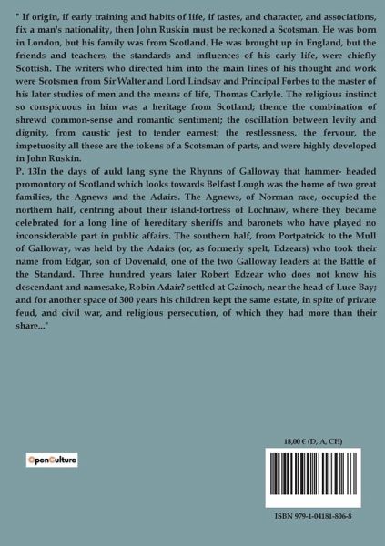 " If origin, if early training and habits of life, if tastes, and character, and associations, fix a man's nationality, then John Ruskin must be reckoned a Scotsman. He was born in London, but his family was from Scotland. He was brought up in England, but the friends and teachers, the standards and influences of his early life, were chiefly Scottish. The writers who directed him into the main lines of his thought and work were Scotsmen from Sir Walter and Lord Lindsay and Principal Forbes to the master of his later studies of men and the means of life, Thomas Carlyle. The religious instinct so conspicuous in him was a heritage from Scotland; thence the combination of shrewd common-sense and romantic sentiment; the oscillation between levity and dignity, from caustic jest to tender earnest; the restlessness, the fervour, the impetuosity all these are the tokens of a Scotsman of parts, and were highly developed in John Ruskin. P. 13In the days of auld lang syne the Rhynns of Galloway that hammer- headed promontory of Scotland which looks towards Belfast Lough was the home of two great families, the Agnews and the Adairs. The Agnews, of Norman race, occupied the northern half, centring about their island-fortress of Lochnaw, where they became celebrated for a long line of hereditary sheriffs and baronets who have played no inconsiderable part in public affairs. The southern half, from Portpatrick to the Mull of Galloway, was held by the Adairs (or, as formerly spelt, Edzears) who took their name from Edgar, son of Dovenald, one of the two Galloway leaders at the Battle of the Standard. Three hundred years later Robert Edzear who does not know his descendant and namesake, Robin Adair? settled at Gainoch, near the head of Luce Bay; and for another space of 300 years his children kept the same estate, in spite of private feud, and civil war, and religious persecution, of which they had more than their share..."