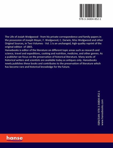 The Life of Josiah Wedgwood - from his private correspondence and family papers in the possession of Joseph Mayer, F. Wedgwood, C. Darwin, Miss Wedgwood and other Original Sources, in Two Volumes - Vol. 1 is an unchanged, high-quality reprint of the original edition of 1865.Hansebooks is editor of the literature on different topic areas such as research and science, travel and expeditions, cooking and nutrition, medicine, and other genres. As a publisher we focus on the preservation of historical literature. Many works of historical writers and scientists are available today as antiques only. Hansebooks newly publishes these books and contributes to the preservation of literature which has become rare and historical knowledge for the future.