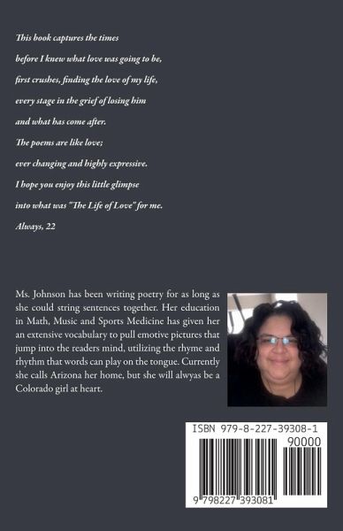 This book captures the times before I knew what love was going to be, first crushes, finding the love of my life, every stage in the grief of losing him and what has come after. The poems are like love; ever changing and highly expressive. I hope you enjoy this little glimpse into what was "The Life of Love" for me. Always, 22