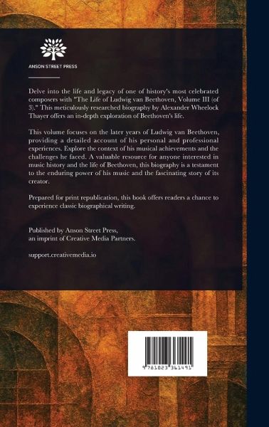 Delve into the life and legacy of one of history's most celebrated composers with "The Life of Ludwig van Beethoven, Volume III (of 3)." This meticulously researched biography by Alexander Wheelock Thayer offers an in-depth exploration of Beethoven's life. This volume focuses on the later years of Ludwig van Beethoven, providing a detailed account of his personal and professional experiences. Explore the context of his musical achievements and the challenges he faced. A valuable resource for anyone interested in music history and the life of Beethoven, this biography is a testament to the enduring power of his music and the fascinating story of its creator. Prepared for print republication, this book offers readers a chance to experience classic biographical writing. This work has been selected by scholars as being culturally important, and is part of the knowledge base of civilization as we know it. This work is in the public domain in the United States of America, and possibly other nations. Within the United States, you may freely copy and distribute this work, as no entity (individual or corporate) has a copyright on the body of the work. Scholars believe, and we concur, that this work is important enough to be preserved, reproduced, and made generally available to the public. We appreciate your support of the preservation process, and thank you for being an important part of keeping this knowledge alive and relevant.