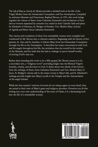 The Life of Mary as Seen by the Mystics provides a detailed look at the life of the Virgin Mother from the Immaculate Conception until her Assumption. Compiled by reference librarian and Franciscan, Raphael Brown, in 1951, this work brings together the visions and revelations of four devout women separated by centuries but united in their Catholic faith and piety. Not much is said in the Biblical gospels of Mathew, Mark, Luke and John regarding the life of Mary. After all, their gospels were intended to tell the story of Christ - his birth, teachings, crucifixion and ascension. The Life of Mary as Seen by the Mystics provides greater context to the life of Jesus Christ by bringing the reader closer to his earthly mother. It explains the trials she suffered in order to bring about the salvation of mankind. This work is unique in that not only is it focused entirely on the Virgin Mary, but its sources were all women as well. The four "mystics" whose writings make up the basis of this work lived in different times and different nations. But they were all devout Catholics who dedicated their lives to their faith. St. Elizabeth of Schönau lived from 1129 to 1164. Born in the Rhineland, she entered Schönau Abbey, where she became an abbess. Her visions were known across Europe, and she was often consulted for advice by learned and religious men. St. Bridget of Sweden, born in 1303, was the daughter of a wealthy provincial governor. She did not enter a convent, but rather married and had 8 children. After her husband's death, she entered the Franciscan order and dictated over 1,500 pages of revelations regarding the Passion of Christ and the Nativity. Ven. Mother Mary of Jesus of Agreda was born in Spain in 1602. She founded the Monastery of the Immaculate Conception with her mother and sisters, where she was elected abbess 11 times. Mary of Jesus was said to have visited the New World through bilocation - being in two places at the same time. She appeared and spoke to Native Americans in Texas, New Mexico, and Arizona without ever leaving Spain. The content of her book, The Mystical City of God, forms part of the basis of The Life of Mary as Seen by the Mystics. Sister Anna Catherine Emmerich was born to poor Westphalian peasants in 1774. She spent 10 years in a convent, but when it was closed in 1812 she moved to a private home where she spent the rest of her life. She claimed (not without controversy) to have experienced the wounds of Christ, and to witness his daily teachings over the course of three years. She dictated her visions to Clemens Brentano, who later published them based on his notes. The visions and revelations of these four remarkable women were compiled and condensed by Mr. Brown into a coherent narrative. Beginning with the history of her parents, St. Ann and St. Joachim, it follows Mary from her Immaculate Conception through her life to the Assumption. It describes her many conversations with God and his angels throughout her life, the revelation that she would be the mother of the Messiah, and the trials that she had to undergo to prove herself worthy of serving God's only son. Rather than intending this work to be a fifth gospel, Mr. Brown meant it to be a secondary text, a "religious novel" providing insight into the Blessed Virgin's humility, charity, and devotion to God. It draws about two-thirds of the history from the writings of Sister Anna Catherine Emmerich and Ven. Mother Mary of Jesus. St. Bridget's visions add to the major events in Mary's life, and St. Elizabeth's writings provide insight into Mary's youth in the Temple and the Annunciation of the angel Gabriel.