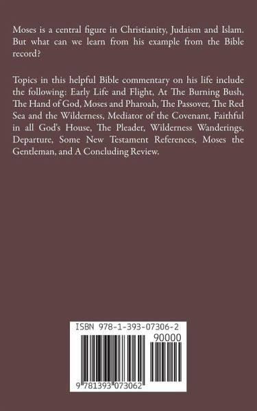 Moses is a central figure in Christianity, Judaism and Islam. But what can we learn from his example from the Bible record? This biography covers the key episodes and lessons from his life. CHAPTER ONE: EARLY LIFE AND FLIGHT CHAPTER TWO: AT THE BURNING BUSH CHAPTER THREE: THE HAND OF GOD CHAPTER FOUR: MOSES AND PHAROAH CHAPTER FIVE: THE PASSOVER CHAPTER SIX: THE RED SEA AND THE WILDERNESS CHAPTER SEVEN: MEDIATOR OF THE COVENANT CHAPTER EIGHT: FAITHFUL IN ALL GOD'S HOUSE CHAPTER NINE: THE PLEADER CHAPTER TEN: WILDERNESS WANDERINGS CHAPTER ELEVEN: DEPARTURE CHAPTER TWELVE: SOME NEW TESTAMENT REFERENCES CHAPTER THIRTEEN: MOSES THE GENTLEMAN CHAPTER FOURTEEN: CONCLUDING REVIEW