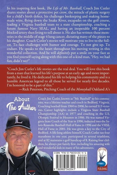 In his inspiring first book, The Life of Mr. Baseball, Coach Jim Cutler shares stories about a protective pet crow, the miracle of plastic surgery for a child's birth defect, his challenges beekeeping and making homemade wine, flying down the Snake River, escapades on the golf course, leading a Virginia baseball team to a state championship, coaching a future famous Navy SEAL, and having an inoperable 100 percent blocked artery then living to tell about it. He also has written these memories in the middle of stage 4 lung cancer, dictating many of the pieces to his daughter. Coach Cutler's stories will motivate you to live to the fullest. To face challenges with humor and courage. To not give up. To endure. He speaks to the heart throughout his moving writing in this wonderful collection. And he will definitely put a smile on your face as you find yourself saying along with this one-of-a-kind man, "Hey, we had fun, didn't we?" As Brian "Iron Ed" Hiner, Navy SEAL Lieutenant Commander (Ret.) (Author of GUTS: Greatness Under Tremendous Stress; Los Angeles Times Bestselling Author of First, Fast, Fearless), says, "Coach Cutler gives us a peek behind the curtain of the character of one of the winningest baseball coaches in Virginia history. I've known Coach for almost 40 years, and in his book, I got to relive our relationship and hear the stories of one of our unsung heroes who always served others with his heart and soul. In his words and in his kindness he will make you want to be a better person."