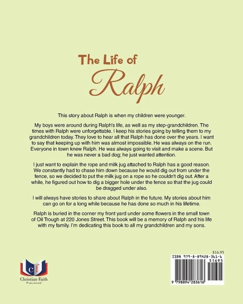 This story about Ralph is when my children were younger. My boys were around during Ralph's life, as well as my step-grandchildren. The times with Ralph were unforgettable. I keep his stories going by telling them to my grandchildren today. They love to hear all that Ralph has done over the years. I want to say that keeping up with him was almost impossible. He was always on the run. Everyone in town knew Ralph. He was always going to visit and make a scene. But he was never a bad dog; he just wanted attention. I just want to explain the rope and milk jug attached to Ralph has a good reason. We constantly had to chase him down because he would dig out from under the fence, so we decided to put the milk jug on a rope so he couldn't dig out. After a while, he figured out how to dig a bigger hole under the fence so that the jug could be dragged under also. I will always have stories to share about Ralph in the future. My stories about him can go on for a long while because he has done so much in his lifetime. Ralph is buried in the corner my front yard under some flowers in the small town of Oil Trough at 220 Jones Street. This book will be a memory of Ralph and his life with my family. I'm dedicating this book to all my grandchildren and my sons.