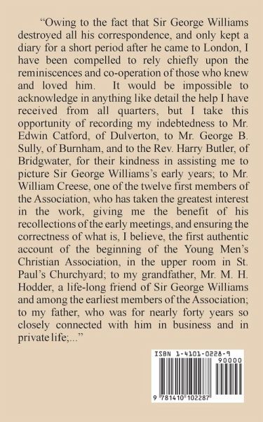 "Owing to the fact that Sir George Williams destroyed all his correspondence, and only kept a diary for a short period after he came to London, I have been compelled to rely chiefly upon the reminiscences and co-operation of those who knew and loved him. It would be impossible to acknowledge in anything like detail the help I have received from all quarters, but I take this opportunity of recording my indebtedness to Mr. Edwin Catford, of Dulverton, to Mr. George B. Sully, of Burnham, and to the Rev. Harry Butler, of Bridgwater, for their kindness in assisting me to picture Sir George Williams's early years; to Mr. William Creese, one of the twelve first members of the Association, who has taken the greatest interest in the work, giving me the benefit of his recollections of the early meetings, and ensuring the correctness of what is, I believe, the first authentic account of the beginning of the Young Men's Christian Association, in the upper room in St. Paul's Churchyard; to my grandfather, Mr. M. H. Hodder, a life-long friend of Sir George Williams and among the earliest members of the Association; to my father, who was for nearly forty years so closely connected with him in business and in private life;..."