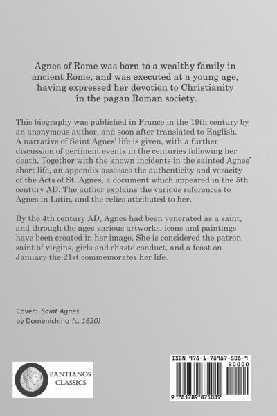 Agnes of Rome was born to a wealthy family in ancient Rome, and was executed at a young age, having expressed her devotion to Christianity in the pagan Roman society. This biography was published in France in the 19th century by an anonymous author, and soon after translated to English. A narrative of Saint Agnes' life is given, with a further discussion of pertinent events in the centuries following her death. Together with the known incidents in the sainted Agnes' short life, an appendix assesses the authenticity and veracity of the Acts of St. Agnes, a document which appeared in the 5th century AD. The author explains the various references to Agnes in Latin, and the relics attributed to her. By the 4th century AD, Agnes had been venerated as a saint, and through the ages various artworks, icons and paintings have been created in her image. She is considered the patron saint of virgins, girls and chaste conduct, and a feast on January the 21st commemorates her life.