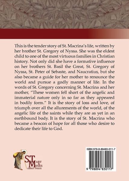 This is the tender story of St. Macrina's life, written by her brother St. Gregory of Nyssa. She was the eldest child to one of the most virtuous families in Christian history. Not only did she have a formative influence on her brothers St. Basil the Great, St. Gregory of Nyssa, St. Peter of Sebaste, and Naucratius, but she also became a guide for her mother to renounce the world and pursue a godly manner of life. In the words of St. Gregory concerning St. Macrina and her mother, "These women fell short of the angelic and immaterial nature only in so far as they appeared in bodily form." It is the story of loss and love, of triumph over all the allurements of the world, of the angelic life of the saints while they are as yet in an earthbound body. It is the story of St. Macrina who became a beacon of hope for all those who desire to dedicate their life to God.