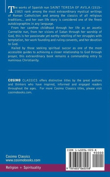 The works of Spanish nun SAINT TERESA OF AVILA (1515-1582) rank among the most extraordinary mystical writings of Roman Catholicism and among the classics of all religious traditions... and her own life story is considered one of the finest autobiographies in any language. From her carefree childhood through her life as an ascetic Carmelite nun, from her visions of Satan through her worship of God, this is her passionate yet earthy retelling of her struggles with temptation, her work founding and ruling convents, and her devotion to God. Hailed by those seeking spiritual succor as one of the most accessible guides to achieving a closer relationship to God through prayer, this extraordinary book remains a commanding entry to numinous Christianity.