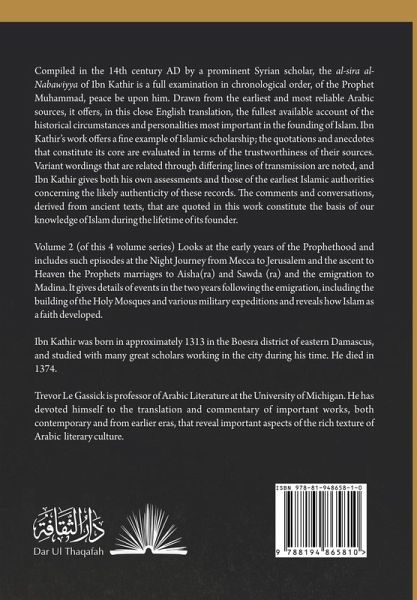 Compiled in the 14th century AD by a prominent Syrian scholar, the As-Seerah An-Nabawiyya of Imam Ibn Kathir is a full examination in chronological order, of the Prophet Muhammad, peace be upon him. Drawn from the earliest and most reliable Arabic sources, it offers, in this close English translation, the fullest available account of the historical circumstances and personalities most important in the founding of Islam. Ibn Kathir's work offers a fine example of Islamic scholarship; the quotations and anecdotes that constitute its core are evaluated in terms of the trustworthiness of their sources. Variant wordings that are related through differing lines of transmission are noted, and Ibn Kathir gives both his own assessments and those of the earliest Islamic authorities concerning the likely authenticity of these records. The comments and conversations derived from ancient texts that are quoted in this work constitute the basis of our knowledge of Islam during the lifetime of its founder. Volume 2 (of this 4-volume series) looks at the early years of the Prophethood and includes episodes such as the Night Journey from Mecca to Jerusalem and the ascent to Heaven and Prophets (saw) marriage to Aisha (ra) and Sawda (ra) and the emigration to Madina. It gives details of events in the two years following the emigration, including the building of the Holy Mosques and various military expeditions, and reveals how Islam as a faith developed. Ibn Kathir was born in approximately 1313 in the Boesra district of eastern Damascus, and studied with many great scholars working in the city during his time. He died in 1374. Trevor Le Gassick is professor of Arabic Literature at the University of Michigan. He has devoted himself to the translation and commentary of important works, both contemporary and from earlier eras, that reveal important aspects of the rich texture of Arabic literary culture.