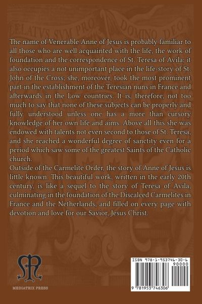 From the Preface "The name of Venerable Anne of Jesus is probably familiar to all those who are well acquainted with the life, the work of foundation and the correspondence of St. Teresa of Avila; it also occupies a not unimportant place in the life-story of St. John of the Cross; she, moreover, took the most prominent part in the establishment of the Teresian nuns in France and afterwards in the Low countries. It is, therefore, not too much to say that none of these subjects can be properly and fully understood unless one has a more than cursory knowledge of her own life and aims. Above all this she was endowed with talents not even second (according to the opinion of St. John of the Cross who was a good judge) to those of St. Teresa, and she reached a wonderful degree of sanctity even for a period which saw some of the greatest Saints of the Catholic church. It was, then, a happy thought that one who in religion had received the same name should have spent many years in collecting all the facts of the life, and all the surviving writings, of her heavenly patroness. The present writer who was able to watch the inception and gradual growth of thebiography can bear testimony to the scrupulous accuracy with which the biographer has fulfilled her task." This is a story that cannot be found in print elsewhere, of the transplanting of the Teresian reform from Spain to France and the Netherlands, a remarkable fete given that all of those countries were at war and the populations of France and the Netherlands not especially amenable to Spaniards. Nevertheless, the roots of Carmel were well planted, and the order flourished in convents still there to this day. This work has been carefully reproduced from the original, with the UK spelling and the original pictures retained. For more information, visit www.mediatrixpress.com