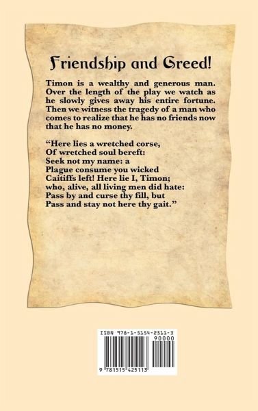 Friendship and Greed!-- Timon is a wealthy and generous man. Over the length of the play we watch as he slowly gives away his entire fortune. Then we witness the tragedy of a man who comes to realize that he has no friends now that he has no money.