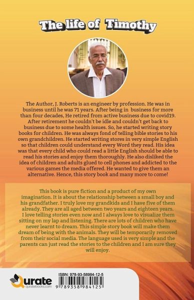 This book is pure fiction and a product of my own imagination. It is about the relationship between a small boy and his grandfather. I truly love my grandkids and I have five of them already. They are all aged between two years and eighteen years. I love telling stories even now and I always love to visualize them sitting on my lap and listening. There are lots of children who have never learnt to dream. This simple story book will make them dream of being with the animals. They will be temporarily removed from their social media. The language used is very simple and the parents can just read the stories to the children and I am sure they will enjoy. About the Author: The Author, J. Roberts is an engineer by profession. He was in business until he was 71 years. After being in business for more than four decades, He retired from active business due to covid19. After retirement he couldn't be idle and couldn't get back to business due to some health issues. So, he started writing story books for children. He was always fond of telling bible stories to his own grandchildren. He started writing stories in very simple English so that children could understand every Word they read. His idea was that every child who could read a little English should be able to read his stories and enjoy them thoroughly. He also disliked the idea of children and adults glued to cell phones and addicted to the various games the media offered. He wanted to give them an alternative. Hence, this story book and many more to come!