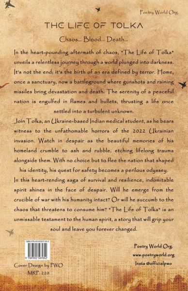 In the heart-pounding aftermath of chaos, "The Life of Tolka" unveils a relentless journey through a world plunged into darkness. It's not the end; it's the birth of an era defined by terror. Home, once a sanctuary, now a battleground where gunshots and raining missiles bring devastation and death. The serenity of a peaceful nation is engulfed in flames and bullets, thrusting a life once settled into a turbulent unknown. Join Tolka, an Ukraine-based Indian medical student, as he bears witness to the unfathomable horrors of the 2022 Ukrainian invasion. Watch in despair as the beautiful memories of his second homeland crumble to ash and rubble, etching lifelong trauma alongside them. With no choice but to flee the nation that shaped his identity, his quest for safety becomes a perilous odyssey. In this heart-rending saga of survival and resilience, indomitable spirit shines in the face of despair. Will he emerge from the crucible of war with his humanity intact? Or will he succumb to the chaos that threatens to consume him? "The Life of Tolka" is an unmissable testament to the human spirit, a story that will grip your soul and leave you forever changed.
