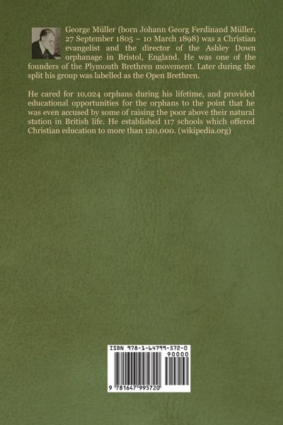 George Müller (born Johann Georg Ferdinand Müller, 27 September 1805 – 10 March 1898) was a Christian evangelist and the director of the Ashley Down orphanage in Bristol, England. He was one of the founders of the Plymouth Brethren movement. Later during the split his group was labelled as the Open Brethren. He cared for 10,024 orphans during his lifetime, and provided educational opportunities for the orphans to the point that he was even accused by some of raising the poor above their natural station in British life. He established 117 schools which offered Christian education to more than 120,000. (wikipedia.org)…mehr