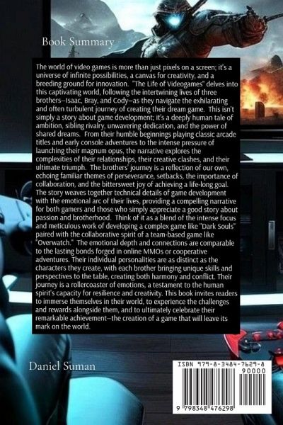 The world of video games is more than just pixels on a screen; it's a universe of infinite possibilities, a canvas for creativity, and a breeding ground for innovation. "The Life of Videogames" delves into this captivating world, following the intertwining lives of three brothers-Isaac, Bray, and Cody-as they navigate the exhilarating and often turbulent journey of creating their dream game. This isn't simply a story about game development; it's a deeply human tale of ambition, sibling rivalry, unwavering dedication, and the power of shared dreams. From their humble beginnings playing classic arcade titles and early console adventures to the intense pressure of launching their magnum opus, the narrative explores the complexities of their relationships, their creative clashes, and their ultimate triumph. The brothers' journey is a reflection of our own, echoing familiar themes of perseverance, setbacks, the importance of collaboration, and the bittersweet joy of achieving a life-long goal. The story weaves together technical details of game development with the emotional arc of their lives, providing a compelling narrative for both gamers and those who simply appreciate a good story about passion and brotherhood. Think of it as a blend of the intense focus and meticulous work of developing a complex game like "Dark Souls" paired with the collaborative spirit of a team-based game like "Overwatch." The emotional depth and connections are comparable to the lasting bonds forged in online MMOs or cooperative adventures. Their individual personalities are as distinct as the characters they create, with each brother bringing unique skills and perspectives to the table, creating both harmony and conflict. Their journey is a rollercoaster of emotions, a testament to the human spirit's capacity for resilience and creativity. This book invites readers to immerse themselves in their world, to experience the challenges and rewards alongside them, and to ultimately celebrate their remarkable achievement-the creation of a game that will leave its mark on the world.