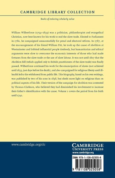 William Wilberforce (1759-1833) was a politician, philanthropist and evangelical Christian, now best known for his work to end the slave trade. Elected to Parliament in 1780, he campaigned unsuccessfully for penal and electoral reform. In 1787, at the encouragement of his friend William Pitt, he took up the cause of abolition at Westminster and lobbied influential people tirelessly, but humanitarian and ethical arguments were slow to overcome the economic interests of those who had made fortunes from the slave trade or the use of slave labour. It was not until 1807 that the Abolition Bill was finally passed. Wilberforce continued his work for emancipation, and also campaigned for religious liberty. This biography, based on his own writings, was published by two of his sons in 1838, but sheds more light on religious than on political aspects of his life. Volume 1 covers the period from his birth until 1792.