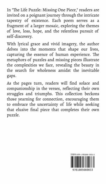 In "The Life Puzzle: Missing One Piece," readers are invited on a poignant journey through the intricate tapestry of existence. Each poem serves as a fragment of a larger mosaic, exploring the themes of love, loss, hope, and the relentless pursuit of self-discovery. With lyrical grace and vivid imagery, the author delves into the moments that shape our lives, capturing the essence of human experience. The metaphors of puzzles and missing pieces illustrate the complexities we face, revealing the beauty in the search for wholeness amidst the inevitable gaps. As the pages turn, readers will find solace and companionship in the verses, reflecting their own struggles and triumphs. This collection beckons those yearning for connection, encouraging them to embrace the uncertainty of life while seeking that elusive final piece that completes their own puzzle.