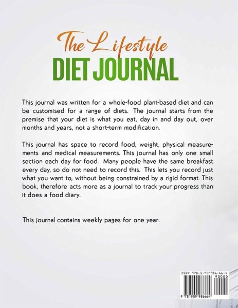 The Lifestyle Diet Journal This journal was written for a whole-food plant-based diet and can be customised for a range of diets. The journal starts from the premise that your diet is what you eat, day in and day out, over months and years, not a short-term modification. Please note that this journal does not provide space for the recording of calories, syns, points or treats. This journal is not Slimming World or WeightWatchers compatible. This journal has space to record food, weight, physical measurements and medical measurements. This journal has only one small section each day for food. Many people have the same breakfast every day, so do not need to record this. This lets you record just what you want to, without being constrained by a rigid format.