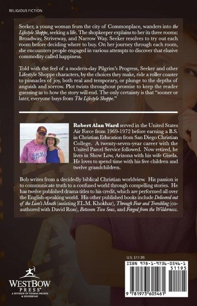Seeker, a young woman from the city of Commonplace, wanders into the Lifestyle Shoppe, seeking a life. The shopkeeper explains to her its three rooms: Broadway, Striveway, and Narrow Way. Seeker resolves to try out each room before deciding where to buy. On her journey through each room, she encounters people engaged in various attempts to discover that elusive commodity called happiness. Told with the feel of a modern-day Pilgrim's Progress, Seeker and other Lifestyle Shoppe characters, by the choices they make, ride a roller coaster to pinnacles of joy, both real and temporary, or plunge to the depths of anguish and sorrow. Plot twists throughout promise to keep the reader guessing as to how the story will end. The only certainty is that "sooner or later, everyone buys from The Lifestyle Shoppe."