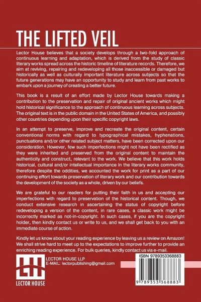 The Lifted Veil This book is a result of an effort made by us towards making a contribution to the preservation and repair of original classic literature. In an attempt to preserve, improve and recreate the original content, we have worked towards: 1. Type-setting & Reformatting: The complete work has been re-designed via professional layout, formatting and type-setting tools to re-create the same edition with rich typography, graphics, high quality images, and table elements, giving our readers the feel of holding a 'fresh and newly' reprinted and/or revised edition, as opposed to other scanned & printed (Optical Character Recognition - OCR) reproductions. 2. Correction of imperfections: As the work was re-created from the scratch, therefore, it was vetted to rectify certain conventional norms with regard to typographical mistakes, hyphenations, punctuations, blurred images, missing content/pages, and/or other related subject matters, upon our consideration. Every attempt was made to rectify the imperfections related to omitted constructs in the original edition via other references. However, a few of such imperfections which could not be rectified due to intentional\unintentional omission of content in the original edition, were inherited and preserved from the original work to maintain the authenticity and construct, relevant to the work. We believe that this work holds historical, cultural and/or intellectual importance in the literary works community, therefore despite the oddities, we accounted the work for print as a part of our continuing effort towards preservation of literary work and our contribution towards the development of the society as a whole, driven by our beliefs. We are grateful to our readers for putting their faith in us and accepting our imperfections with regard to preservation of the historical content. HAPPY READING!