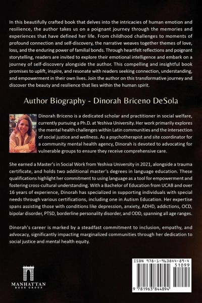 In this beautifully crafted book that delves into the intricacies of human emotion and resilience, the author takes us on a poignant journey through the memories and experiences that have defined their life. From childhood challenges to moments of profound connection and self-discovery, the narrative weaves together themes of love, loss, and the enduring power of familial bonds. Through heartfelt reflections and poignant storytelling, readers are invited to explore their emotional intelligence and embark on a journey of self-discovery alongside the author. This compelling and insightful book promises to uplift, inspire, and resonate with readers seeking connection, understanding, and empowerment in their own lives. Join the author on this transformative journey and discover the beauty and resilience that lies within the human spirit.