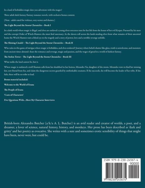 In a land of forbidden magic dare you adventure with the mages? Three adult dark fantasy/fantasy romance novels, with exclusive bonus content. (Note - adult-rated for violence, sexy scenes and themes.) The Light Beyond the Storm Chronicles - Book I In a dark world where magic is illegal, and elves are enslaved a young elven sorceress runs for her life from the house of her evil Keeper. Pursued by his men and the corrupt Order of Witch-Hunters she must find sanctuary. As the slavers roll across the lands stealing elves from what remains of their ancestral home the Witch-Hunters turn a blind eye to the tragedy and a story of power, love and a terrible revenge unfolds. The Shining Citadel - The Light Beyond the Storm Chronicles - Book II Who rules in this game of intrigue where magic is forbidden, and elves enslaved? Journey where beliefs shatter like glass, truth is unwelcome, and monsters from ancient times abound: share the romance and revenge, magic and passion, and the wages of greed in a world of darkest fantasy. The Stolen Tower - The Light Beyond the Storm Chronicles - Book III What stalks the land cannot be, but is. Where magic is outlawed a troll Shaman calls from her deathbed to her heiress, Mirandra Var, daughter of the storm. Mirandra vows to find her missing kin, sort friend from foe, and claim the dangerous secrets guarded by unthinkable creatures. If she succeeds, she will become the leader of her tribe. If she fails, there will be no tribe to lead. Bonus material included: Welcome to the World of Erana The People of Erana 'Casts of Characters' Five Questions With...Meet My Character Interviews