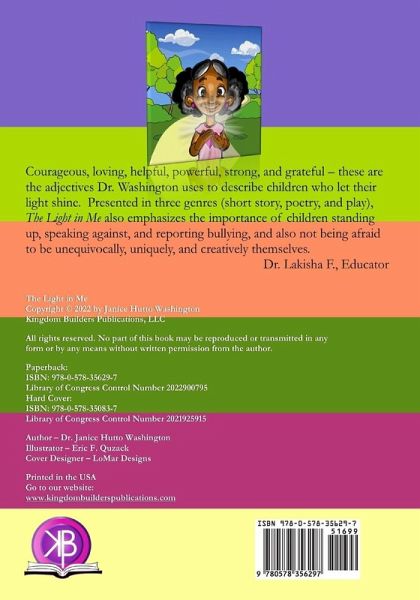 Presented in three genres (short story, poetry, and play), The Light in Me emphasizes the importance of children standing up, speaking against, and reporting bullying, and also not being afraid to be unequivocally, uniquely, and creatively themselves. The author encourages children to bet their powerful light shine in any situation they encounter.