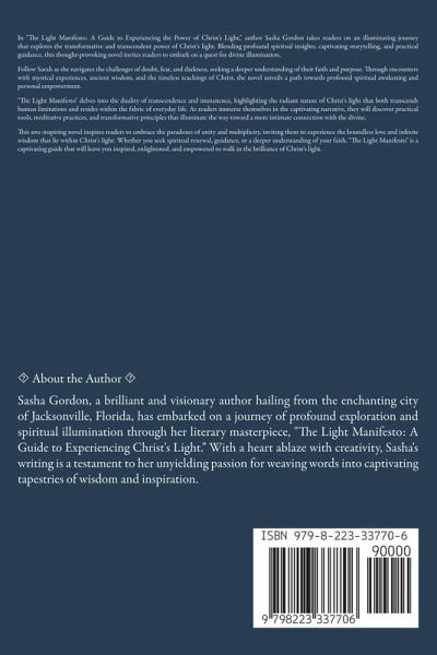 In "The Light Manifesto: A Guide to Experiencing the Power of Christ's Light," author Sasha Gordon takes readers on an illuminating journey that explores the transformative and transcendent power of Christ's light. Blending profound spiritual insights, captivating storytelling, and practical guidance, this thought-provoking novel invites readers to embark on a quest for divine illumination. Follow Sarah as she navigates the challenges of doubt, fear, and darkness, seeking a deeper understanding of their faith and purpose. Through encounters with mystical experiences, ancient wisdom, and the timeless teachings of Christ, the novel unveils a path towards profound spiritual awakening and personal empowerment. "The Light Manifesto" delves into the duality of transcendence and immanence, highlighting the radiant nature of Christ's light that both transcends human limitations and resides within the fabric of everyday life. As readers immerse themselves in the captivating narrative, they will discover practical tools, meditative practices, and transformative principles that illuminate the way toward a more intimate connection with the divine. This awe-inspiring novel inspires readers to embrace the paradoxes of unity and multiplicity, inviting them to experience the boundless love and infinite wisdom that lie within Christ's light. Whether you seek spiritual renewal, guidance, or a deeper understanding of your faith, "The Light Manifesto" is a captivating guide that will leave you inspired, enlightened, and empowered to walk in the brilliance of Christ's light.