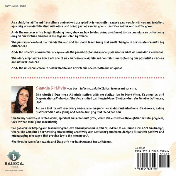 As a child, feel different from others and not well accepted by friends often causes sadness, loneliness and isolation, specially when identificating with other and being part of a social group it is relevant for our healthy grow. Andy the unicorn with a brigth flashing horn, show us how to stop being a victim of the circumstances by focusing only on our virtues and not in the tags inflicted by others. The judicious words of his friends the sun and the moon teach Andy that small changes in our existence make big differences. Andy the unicorn show us that always exists the possibility to find an adequate use for what we consider a weakness. The story emphasizes how each one of us can deliver a significant contribution exploiting our potential richness and natural features. Andy the unicorn is here to celebrate life and enrich our society with our uniqueness.