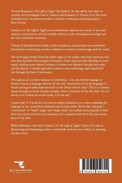 Thomas Burgoyne's The Light of Egypt: The Science of the Soul and the Stars takes an occultist and astrological view of creation and humanity. In Volume II of this work (included here), the author provides a valuable continuation and deepening of these themes. Volume I of The Light of Egypt (not included here) explores the nature of man and creation, reincarnation, and the invisible universe. It also investigates astrology and the way it influences humanity. Volume II (included here) builds on this foundation, and provides more advanced information on astrology, as well as additional concepts of ritual magic and the occult. The book again breaks down the twelve signs of the zodiac, what they represent, and how they manifest their energies in humanity. It also explores astro-theology in more depth, retelling many cultures' stories of creation and salvation through the zodiac and the planets. A similar approach is taken to astro-mythology, exploring Greek lore through the lens of astronomy. Throughout all is a heavy reliance on symbolism, "...the one Divine language of Mother Nature, a language wherein all can read...Symbolism will be the language of Nature as long as spirit expresses itself to the Divine soul of man." This is a common theme throughout much occultist thought, which is founded on the idea that, "As it is above, so it is below; as on the Earth, so in the sky." A great deal of Volume II is devoted to proper definitions, in a sense reclaiming the language of the occult from charlatans and fortune tellers. Words like "talisman," "ceremonial" or "ritual" magic, and "magic wand" are studied etymologically to find their true source and their true meaning, and to separate them from the pop culture ideas of the time. While differing in style from Volume I of The Light of Egypt, Volume II is just as illuminating and fascinating, and is a worthwhile study for any student of astrology and the occult.