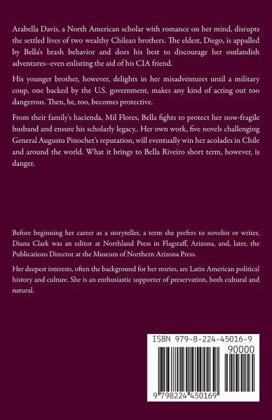 Arabella Davis, a North American scholar with romance on her mind, disrupts the settled lives of two wealthy Chilean brothers. The eldest, Diego, is appalled by Bella's brash behavior and does his best to discourage her outlandish adventures--even enlisting the aid of his CIA friend. His younger brother, however, delights in her misadventures until a military coup, one backed by the U.S. government, makes any kind of acting out too dangerous. Then, he, too, becomes protective. From their family's hacienda, Mil Flores, Bella fights to protect her now-fragile husband and ensure his scholarly legacy.. Her own work, five novels challenging General Augusto Pinochet's reputation, will eventually win her acolades in Chile and around the world. What it brings to Bella Riveiro short term, however, is danger.