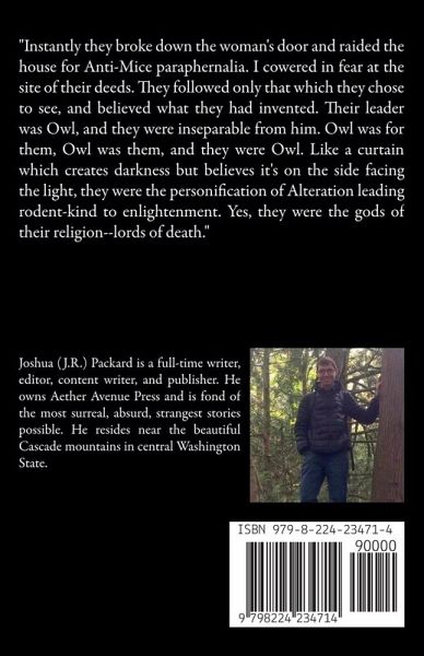 "Instantly they broke down the woman's door and raided the house for Anti-Mice paraphernalia. I cowered in fear at the site of their deeds. They followed only that which they chose to see, and believed what they had invented. Their leader was Owl, and they were inseparable from him. Owl was for them, Owl was them, and they were Owl. Like a curtain which creates darkness but believes it's on the side facing the light, they were the personification of Alteration leading rodent-kind to enlightenment. Yes, they were the gods of their religion--lords of death."
