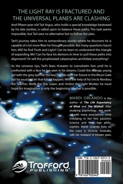 The light ray is fractured and the universal planes are clashing. And fifteen-year-old Tarl Argon, who holds a special knowledge bestowed by his late mother, is called upon to balance these paths. The task seems impossible, but Tarl sees no alternative but to follow the plan. Tarl's journey takes him to extraordinary worlds where he discovers he is capable of a lot more than he thought possible. But many questions haunt him. Will he find Truth and Light? Can he learn to understand the triangle of expanding life? Can he face his demons in time to pull these paths into alignment? Or will the prophesized catastrophes annihilate everything? As the universe rips, Tarl's fears threaten to overwhelm him until he is confronted with a face he has seen in his dreams. Could this strange, young girl with the grey eyes be the key? He has seen her future in the Moon Gate but he must not let that future happen. With the help of his Uncle Rembeu the Teacher, Melik the Star Gazer, and Umbra the Light Worker, he must hope his imagination is only the beginning of what is possible.