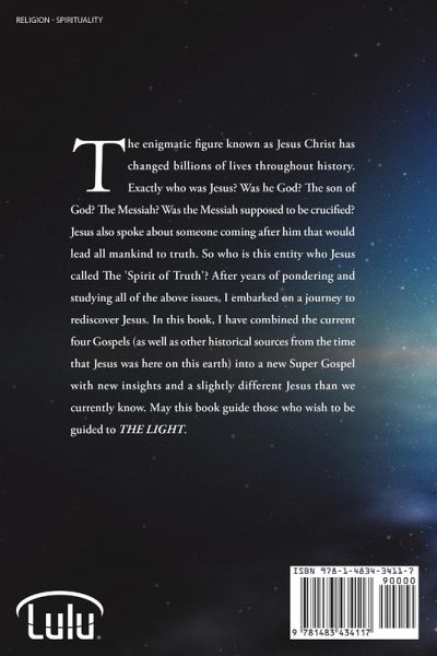 The enigmatic figure known as Jesus Christ has changed billions of lives throughout history. Exactly who was Jesus? Was he God? The son of God? The Messiah? Was the Messiah supposed to be crucified? Jesus also spoke about someone coming after him that would lead all mankind to truth. So who is this entity who Jesus called The 'Spirit of Truth'? After years of pondering and studying all of the above issues, I embarked on a journey to rediscover Jesus. In this book, I have combined the current four Gospels (as well as other historical sources from the time that Jesus was here on this earth) into a new Super Gospel with new insights and a slightly different Jesus than we currently know. May this book guide those who wish to be guided to THE LIGHT.