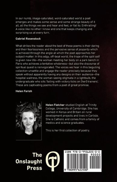 A stunning (and startling) debut collection of daring, thought-provoking, multi-voiced poems from a rising star of the UK scene. According to Helen Farish, "the voices we hear in this beguiling collection unsettle and engage the reader precisely because they speak without apparently having any designs on their audience—the hospital waitress, the woman seeing stigmata in a lightbulb, the undergraduate who sits ‘failing with victory ticks on [her] trainers’. These are captivating poems from a poet of great promise.