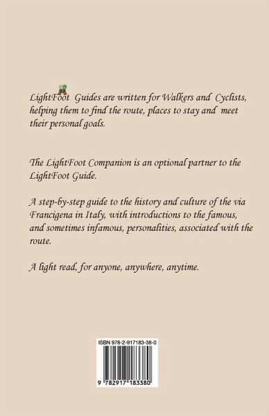 LightFoot Guides are written for Walkers and Cyclists, helping them to find the route, places to stay and meet their personal goals. The LightFoot Companion is an optional partner to the Lightfoot Guide. A step-by-step guide to the history and culture of the via Francigena in Italy, with introductions to the famous, and sometimes infamous, personalities, associated with the route. A light read, for anyone, anywhere, anytime.